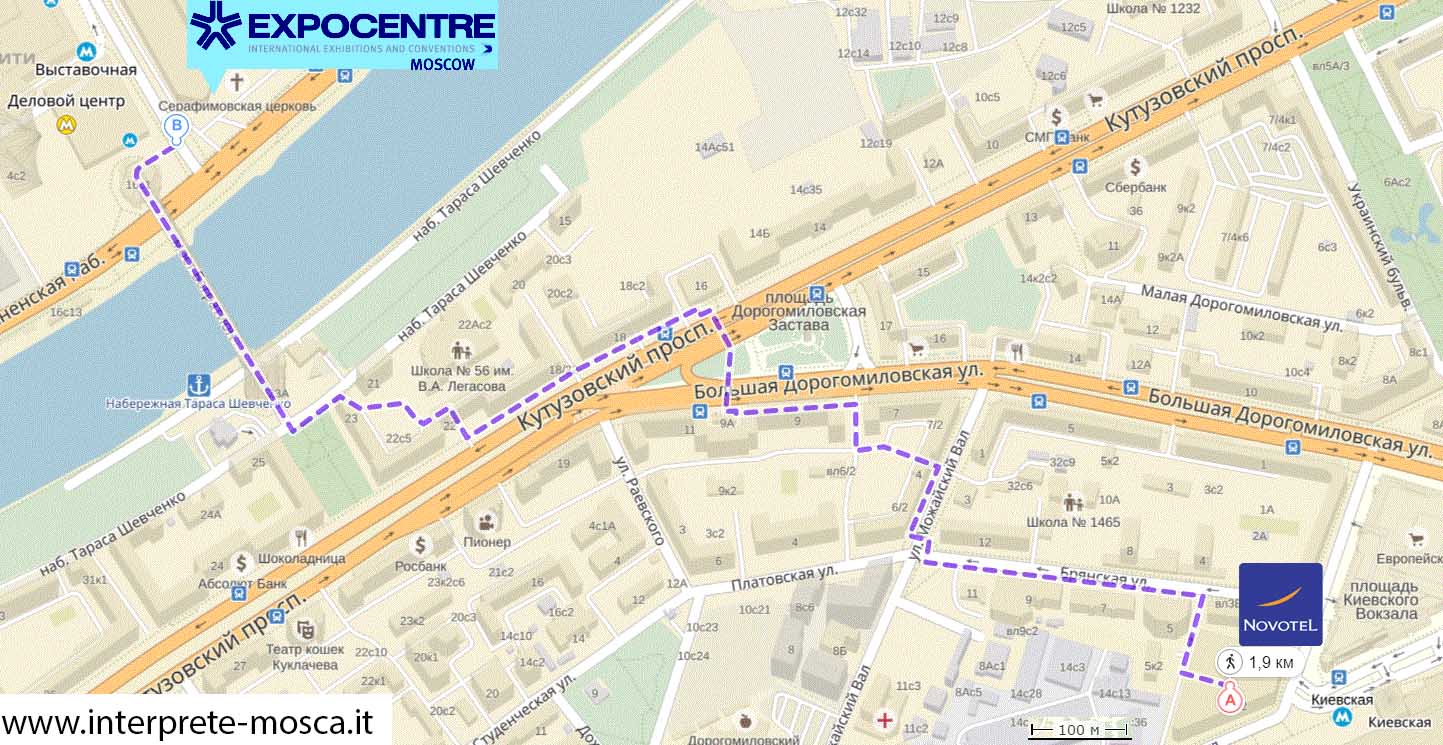 1 fermata fino alla stazione "Vistavochnaja" (linea azzura 4, direzione "Mezdunarodnaja"). La fermata di metropolitana "Kievskaja" si trova a 100 metri dall'albergo, (linea azzurra, n.4 !!!). Attenzione - la destinazione dei treni cambia a vicenda, quindi guardate il cartello luminoso - a voi serve Mezdunarodnaja (in russo "Международная").